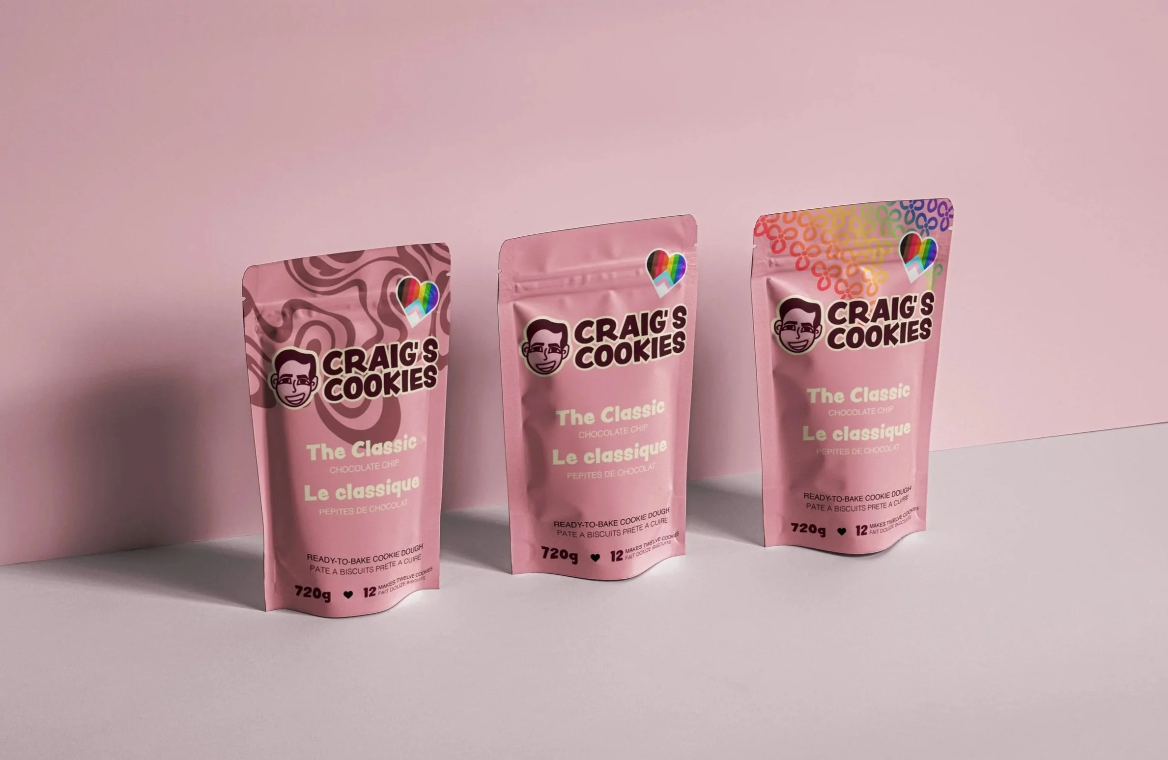 Craig’s Cookies is best recognized for its signature pink box and bold, typographic logo. The brand is also widely celebrated for its strong support of the LGBTQ2S+ community, made visible through its annual Pride Month packaging and year-round heart-shaped pride stickers.