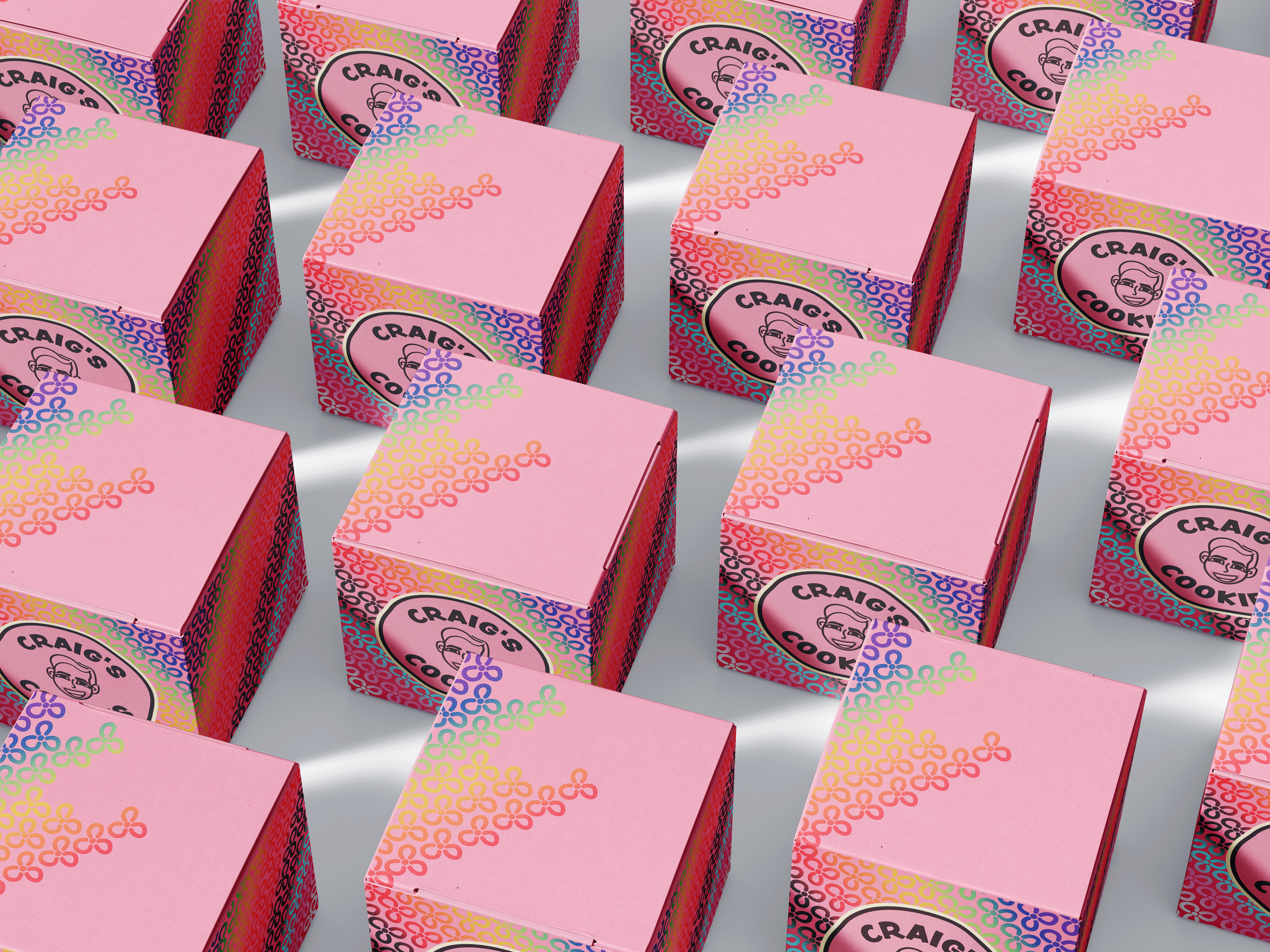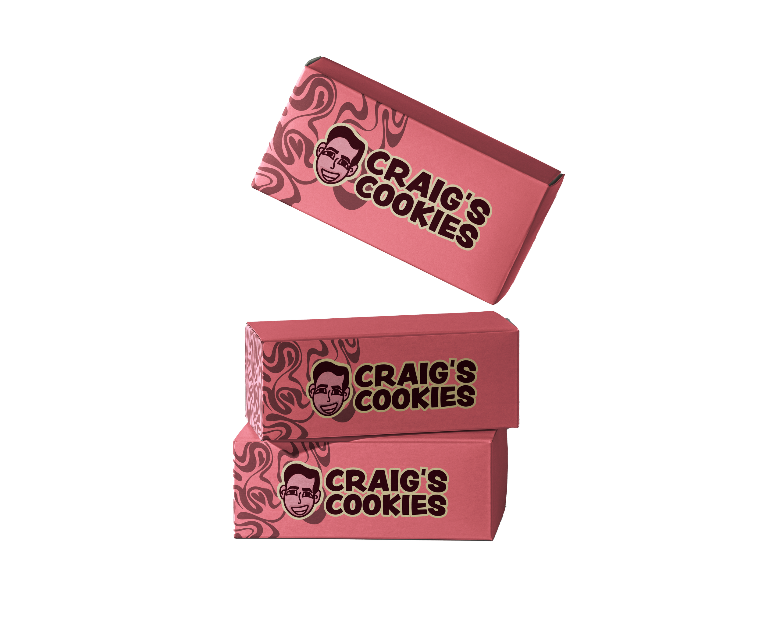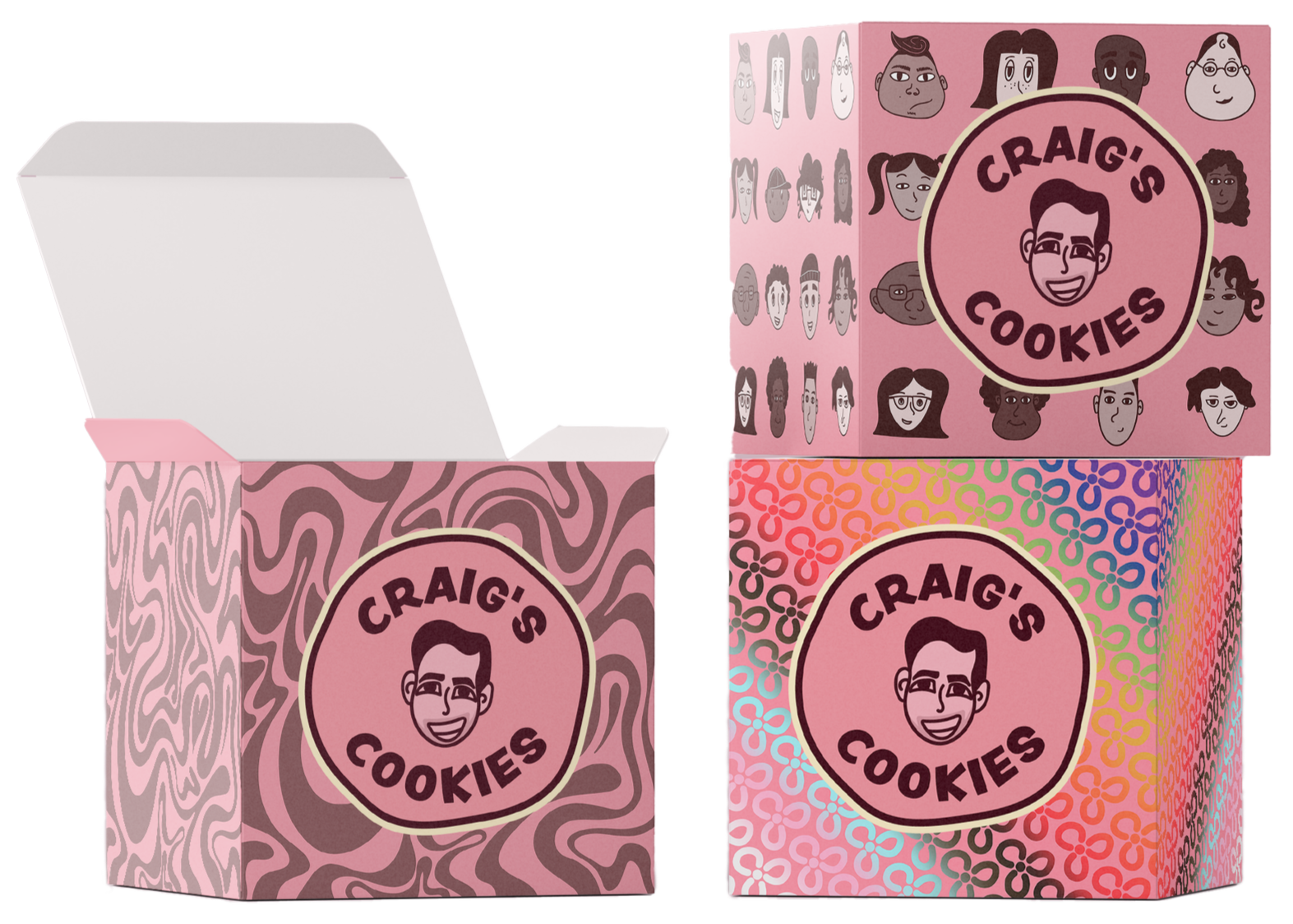 Packaging is one of the most prominent ways Craig’s Cookies communicates its brand identity to customers. It not only surrounds the product but also signals to others that someone is a Craig’s Cookies consumer. After researching competitors, it became clear that many cookie shops rely on similar plain pink boxes with minimal branding. By introducing a human-centered logo and bold, playful patterns, Craig’s Cookies can create a more memorable presence and give customers a stronger visual reference to the brand.