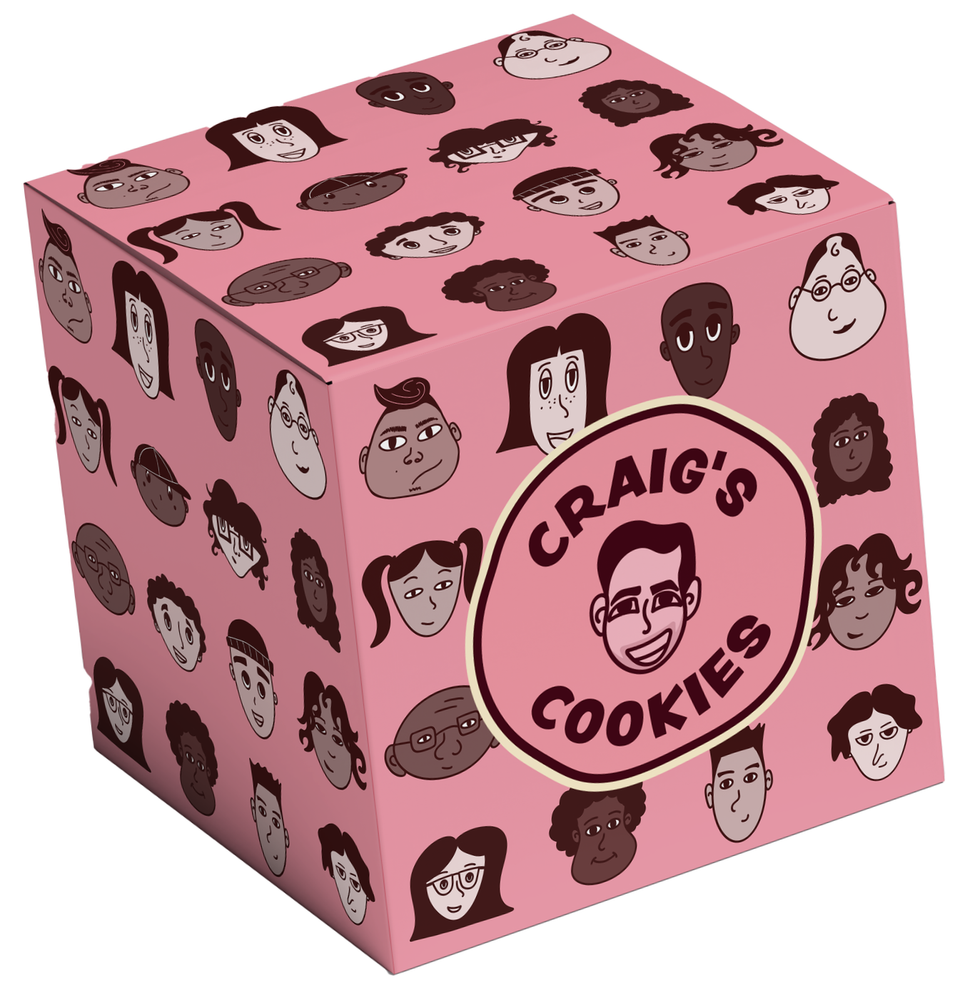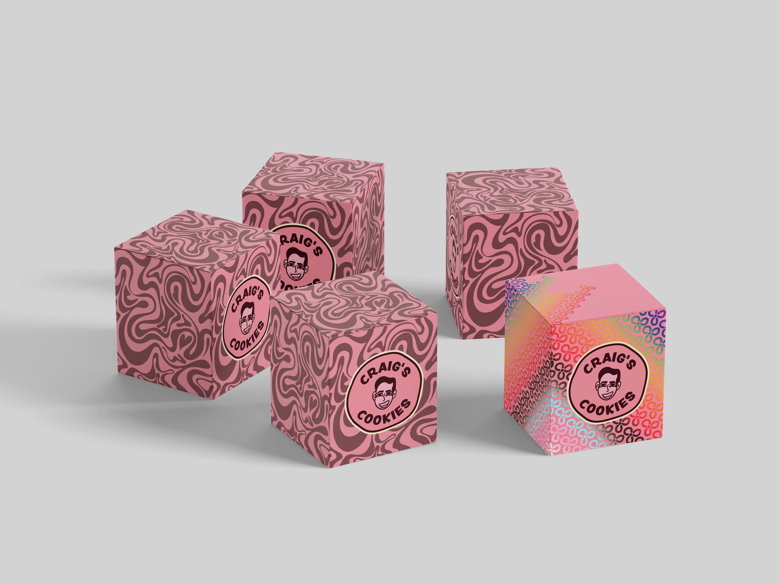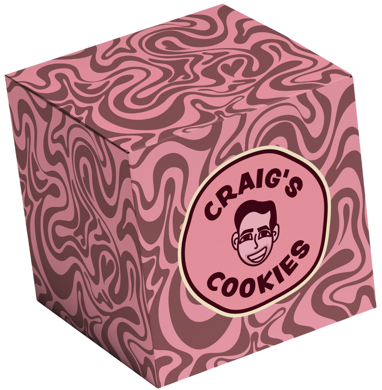Packaging is one of the most prominent ways Craig’s Cookies communicates its brand identity to customers. It not only surrounds the product but also signals to others that someone is a Craig’s Cookies consumer. After researching competitors, it became clear that many cookie shops rely on similar plain pink boxes with minimal branding. By introducing a human-centered logo and bold, playful patterns, Craig’s Cookies can create a more memorable presence and give customers a stronger visual reference to the brand.